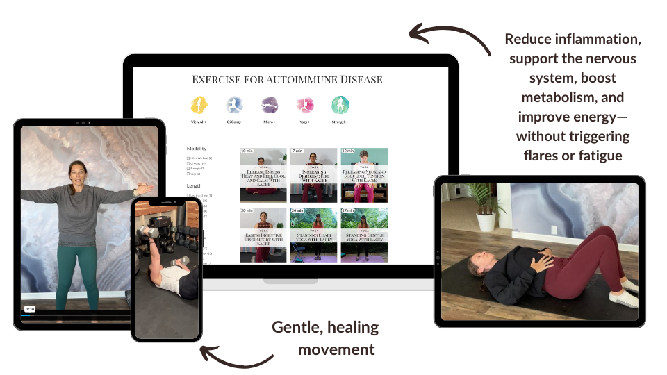 A searchable library of gentle, autoimmune-supportive workouts designed to build strength and resilience without triggering flares. Choose from yoga, Qi Gong, and strength sessions that work with your energy – not against it.